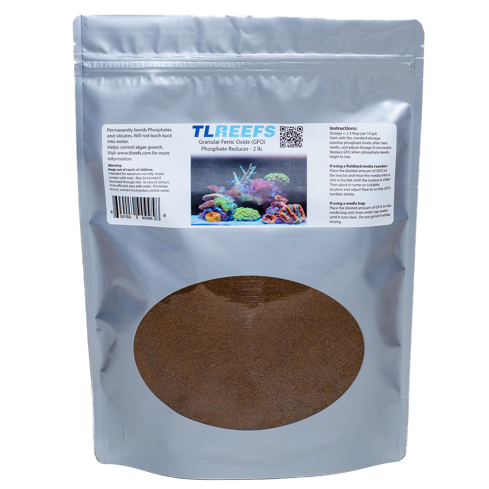 Granular Ferric Oxide is a popular means of reducing and maintaining low phosphate levels in your aquarium. There are many sources of phosphates in your aquarium. They can come from your base rock, fish food, or any other organic matter that enters the tank. They are a leading cause of algae problems, including diatoms, hair algae, and cyanobacteria. GFO removes phosphate by molecular bond and will not leach them back into your water when exhausted.